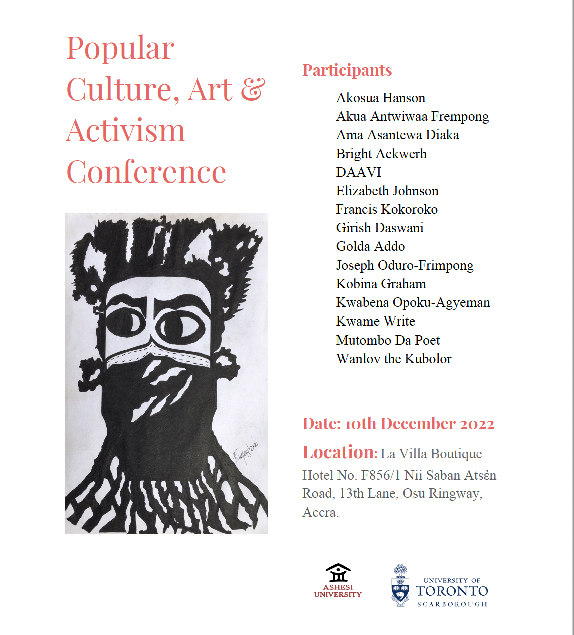 /This panel recording is the fifth instalment of a one-day conference in Accra, Ghana, co-organized by Girish Daswani (University of Toronto Scarborough) and Joseph Oduro-Frimpong (Ashesi University). Panelists included Ghanaian artist-activists and academics working on Political Cartoons, Music and Spoken Word, Photography, Literature, Art and Feminist Activism.